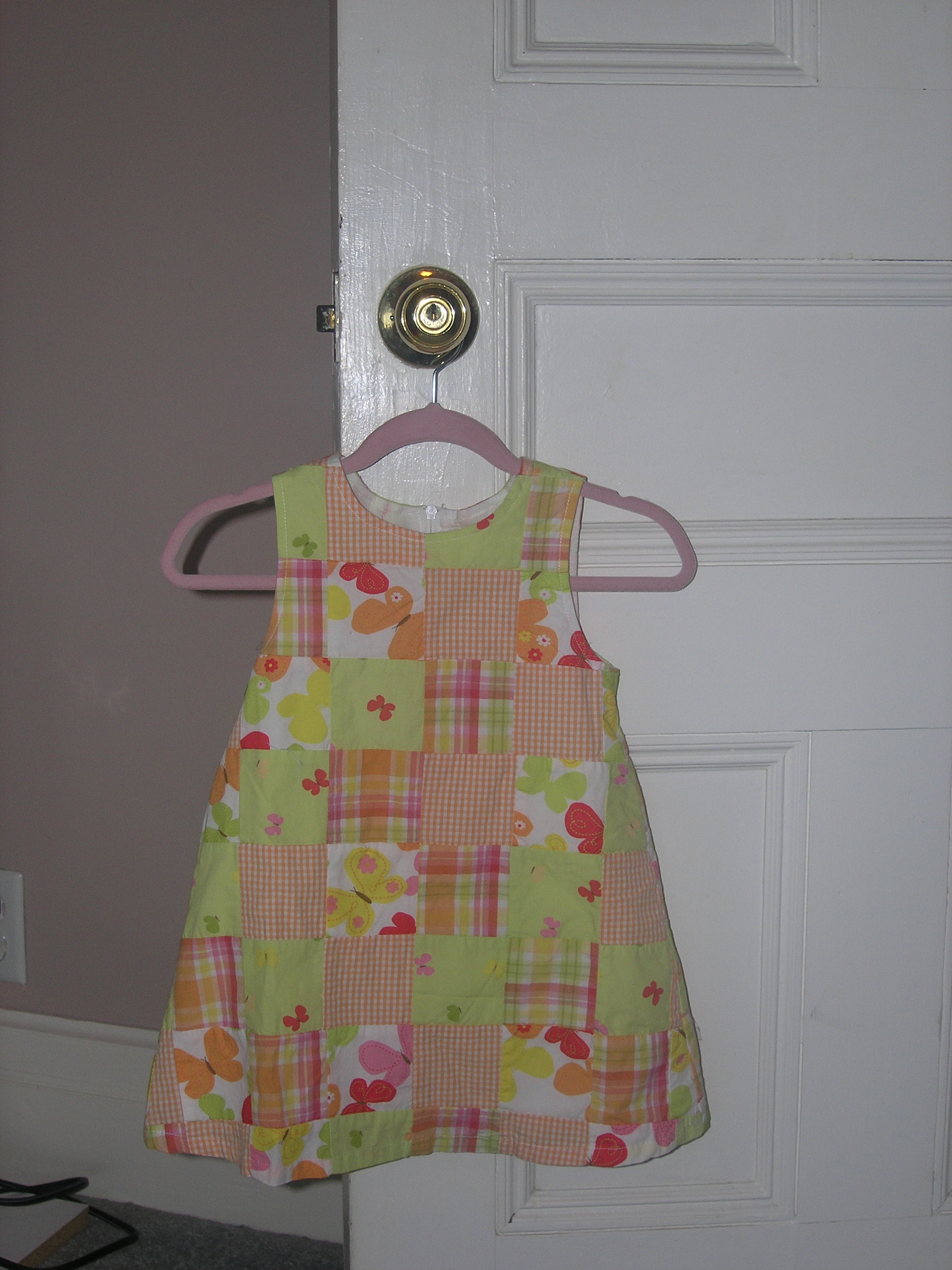 I consoled myself with three yummy items: a dress with a patchwork quilt motif, white pants with colorful butterflies and a few other items, including orange butterfly hair clips. Tell the truth moms: Gymboree is a wonderful store, right?