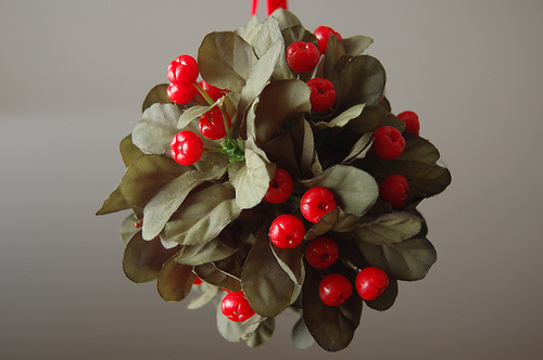 One particularly enjoyable Christmas tradition involves hanging mistletoe. Apparently, English farmers gathered mistletoe in bunches and hung them up in doorways, or other spots, to give guys permission to kiss gals whenever they found themselves under it. Every time a couple kissed, the guy had to pick off one of the berries. Once the berries had all been plucked off, the kissing had to stop.