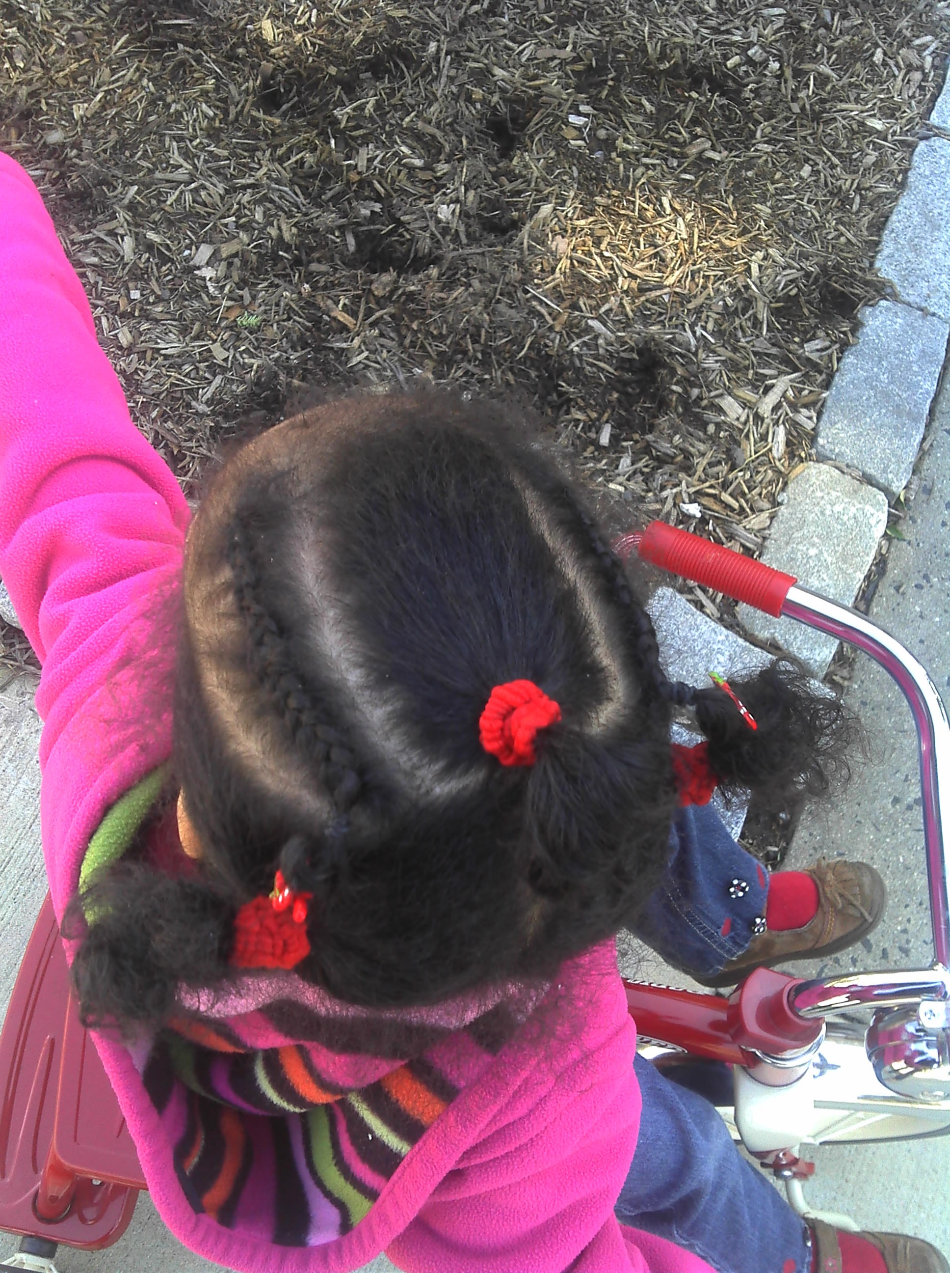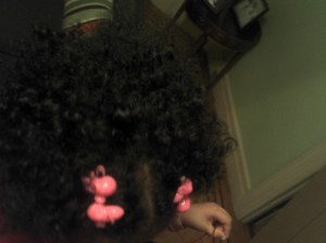 Here is a quick, working-mom style that I put into Baby’s hair a few weeks ago. I did the two cornrows near her temples, not too tight, and secured the ends with small rubber bands moistened with coconut oil. That pretty much left the rest of her hair in pre-parted sections. For the rest of the week, all I did was put twists or plaits into the large sections at night. In the mornings I swept them into ponytails with a Goody rubber-based styling brush. I secured them with ponytail holders, and changed the colors to match her outfit everyday. If we had extra time in the morning (often we didn’t) I twisted the ponytail ends and clipped them into little barrettes. Now I’ve accepted the fact that I have to twists the ends, otherwise they will frizz and split, maybe lead to breakage. So that means getting up 15 extra minutes in the morning to do everything right. Hey, I wanted a girl, and I sure got one! LOL.