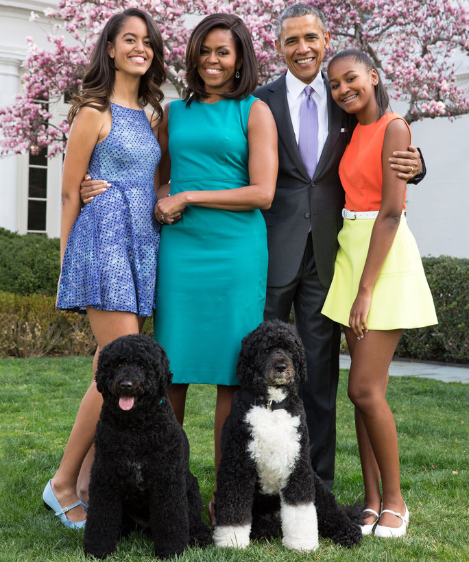WASHINGTON, DC – APRIL 05: U.S. President Barack Obama, First Lady Michelle Obama, and daughters Malia (L) and Sasha (R) pose for a family portrait with their pets Bo and Sunny in the Rose Garden of the White House on Easter Sunday, April 5, 2015 in Washington, DC. (Photo by Pete Souza/The White House via Getty Images)