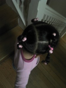 Now that Baby’s hair is long enough to style almost every day, I feel like I should make an effort to send her out-of-doors putting her best foot forward. A few weeks ago, I decided that I didn’t want to deal with brushing and parting her hair every morning. Hubby and I both have jobs with frequent writing deadlines, so minutes in the morning are precious.